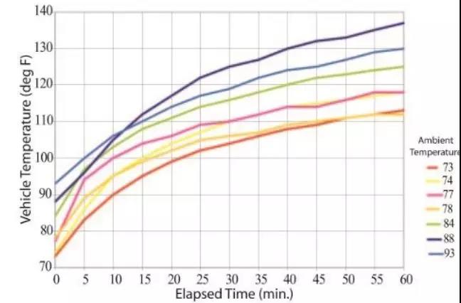 大家可以看一下,不同环境温度下,车内温度的变化曲线基本一致▼