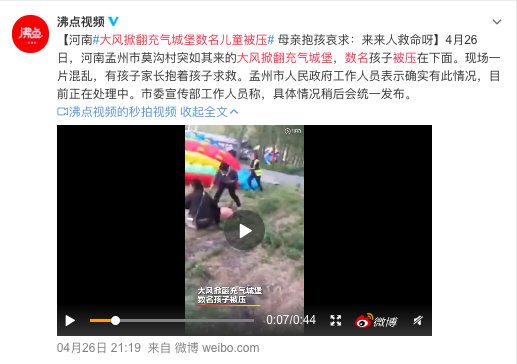 而一旦出事,充气城堡光溜溜的,根本没有地方可抓,个头小的孩子会直接被甩出去。更可怕的是,还有可能被侧翻的充气城堡压在身上。