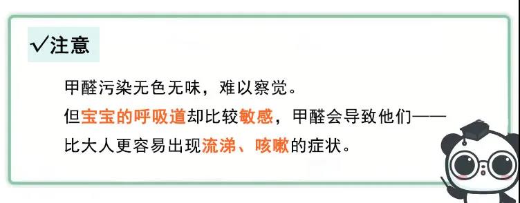 婴儿床、婴儿新玩具及一些家里的合成板材都会散发出甲醛,它的释放周期甚至可以达到 3~15 年。