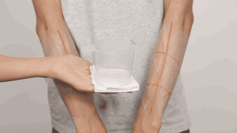 为了让效果更直观,我们把防晒霜涂在测试人员手臂上停留4小时,做了4次实验。