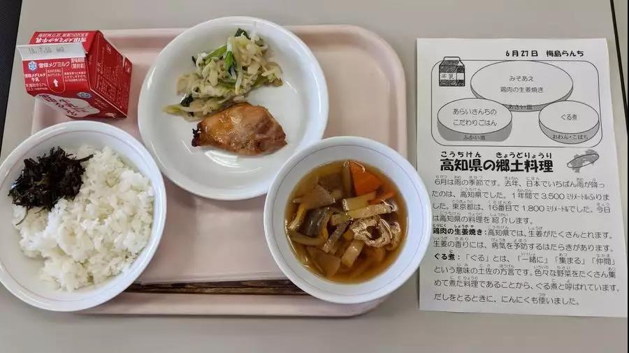 比如这天的午餐,主题是高知县的乡土料理:生姜鸡和杂菜汤,顺带还科普了下高知县的地理跟气候: