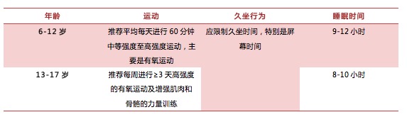 结合2016年美国睡眠医学会发布的《儿童和青少年最佳睡眠时间共识》,我们也对5-17岁儿童及青少年的运动、久坐、睡眠时间进行了汇总建议——
