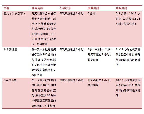 世界卫生组织和国际电信联盟2020发布了“Development of WHO Guidelines on Physical Activity, Sedentary Behavior,and Sleep for Children Less Than 5 Years of Age,即《5岁以下儿童身体活动、久坐行为和睡眠指南》,该指南适用于所有5岁以下的健康儿童,不受性别、文化背景或者家庭社会经济状况限制,具体如下表所示——