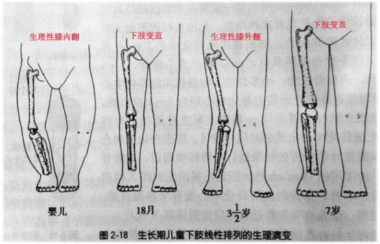 从图可以看出,婴儿出生后都是“O型腿”,也就是医学上所谓的“膝内翻”,通常在孩子学走路时家长才会注意到孩子“O型腿”的情况,从而带孩子就诊,但这种情况是正常的,无需任何处理,随着孩子生长大约在1岁半到2岁时“O型腿”就会自然变直,这一过程称为“生理性膝内翻”。