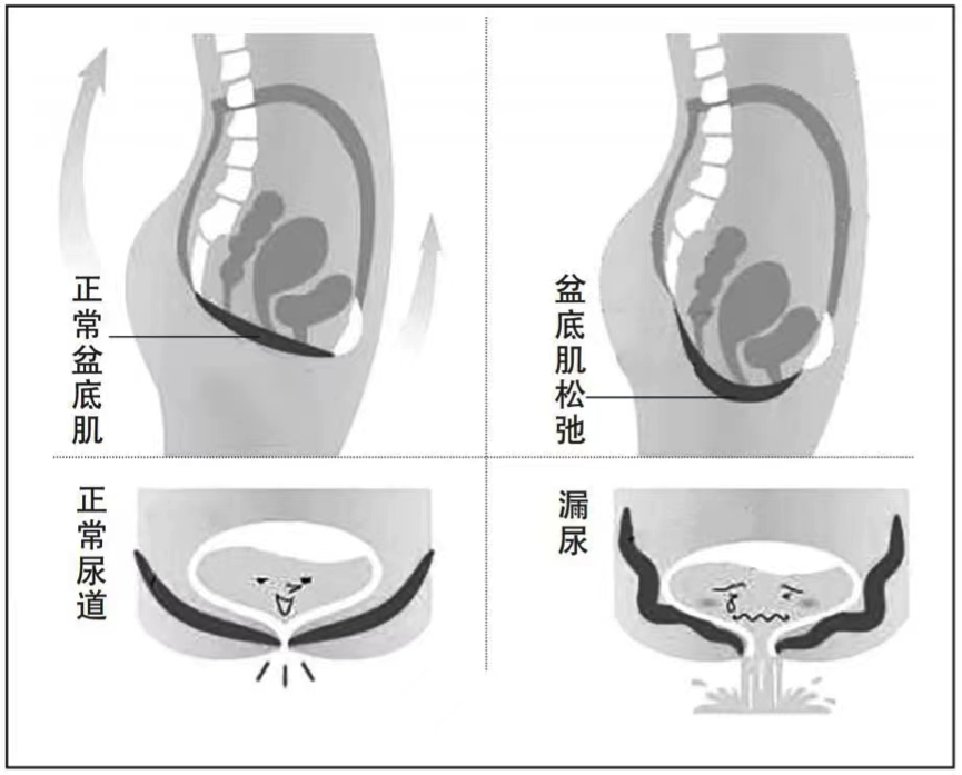 盆底肌是骨盆底的肌肉,它就像一张“吊床“,从下方托住盆腔内的膀胱、尿道、子宫、直肠、阴道、前列腺等脏器。如上图所示,由于分娩等因素,女性的盆底肌更易出现松弛、漏尿等情况,十分尴尬。